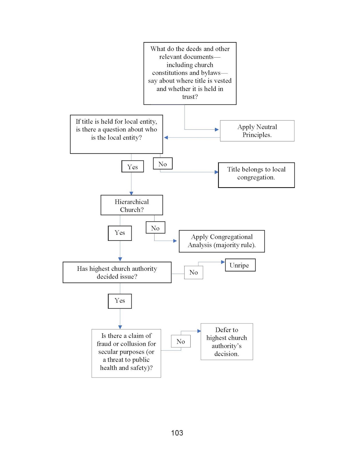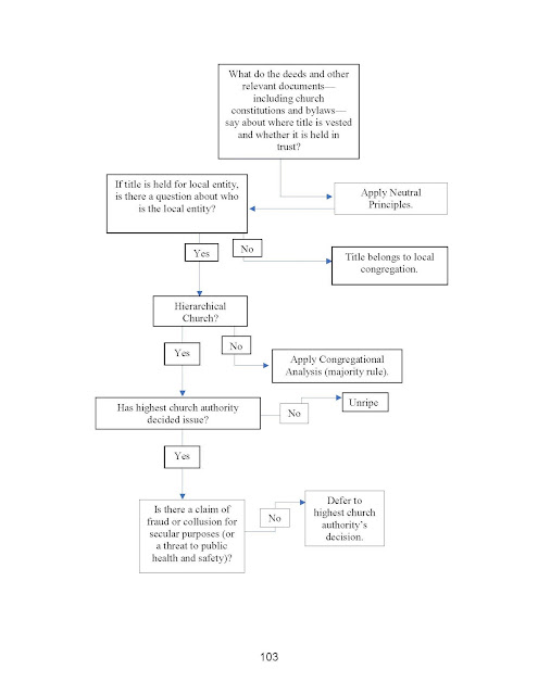 A regular reader of this column should know by now of the church-property-law parameter called “neutral principles.” The Court’s decision tree acknowledges that Texas follows neutral principles in deciding church property disputes (see the very second node at the top of the tree).