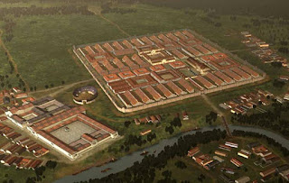 Look at the Israel Museum model of Fortress Antonia once again (above). How many Roman soldiers can you imagine squeezed into such a space? Even if one makes a generous assumption that there was a full 1.5 acres inside the model’s fort, that translates into just 65,000 square feet. Allowing just 65 square feet (13′ x 5′) for each soldier’s tent and personal space, that means a maximum of 1,000 soldiers could be squeezed into the fortress grounds, without allowing any space for avenues, markets, baths, temples, exercise grounds and other areas found in a typical Roman camp of the first century, such as this one: