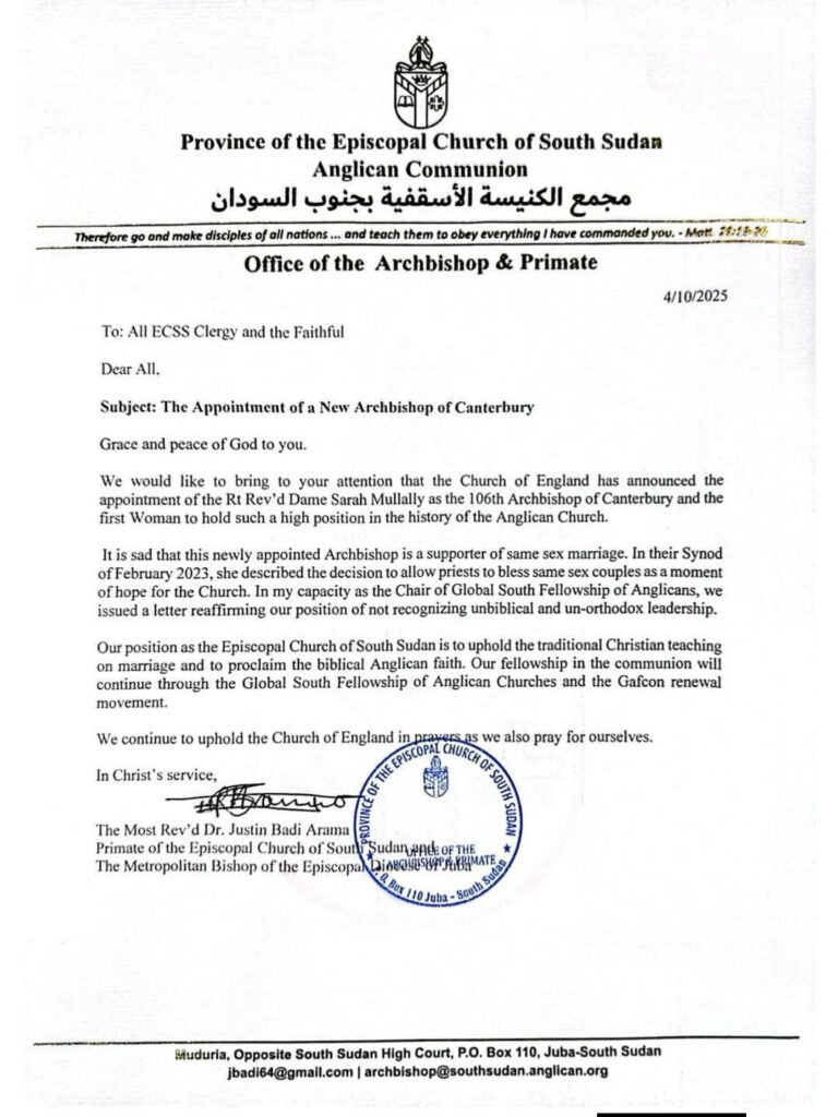 HomeMessagesArchbishop of Juba's statement on the appointment of a new Archbishop of... Archbishop of Juba’s statement on the appointment of a new Archbishop of Canterbury Messages Published on October 6, 2025 By Justin Badi Arama FacebookTwitterPinterestWhatsApp Please Help Anglican.Ink with a donation. TagsChurch of EnglandEpiscopal Church of South Sudan SourceEpiscopal Church of South Sudan Latest articles Messages SC Standing Committee calls for Inhibition of ++Wood To: The Anglican Diocese of South Carolina Grace, mercy, and peace from God the Father... November 15, 2025 News USPG conference on Anti-Human Trafficking and Modern Slavery held in India United Society Partners in the Gospel (USPG) successfully organised a Global Conference on Anti-Human... November 14, 2025 Messages First letter to the Faithful of the Diocese of the Highveld from the Intervention Task Team First-Communication-by-ITTDownload November 14, 2025 Op-Ed What is the future for complementarians in the CofE? The Bishop of Ebbsfleet, the Right Revd Dr Rob Munro, has written to the... November 14, 2025 Press Releases Archbishops’ Council response to Charity Commission case review Following the publication of the Charity Commission case review on safeguarding improvements, a spokesperson... November 14, 2025 More like this Messages SC Standing Committee calls for Inhibition of ++Wood To: The Anglican Diocese of South Carolina Grace, mercy, and peace from God the Father... November 15, 2025 News USPG conference on Anti-Human Trafficking and Modern Slavery held in India United Society Partners in the Gospel (USPG) successfully organised a Global Conference on Anti-Human... November 14, 2025 Messages First letter to the Faithful of the Diocese of the Highveld from the Intervention Task Team First-Communication-by-ITTDownload November 14, 2025