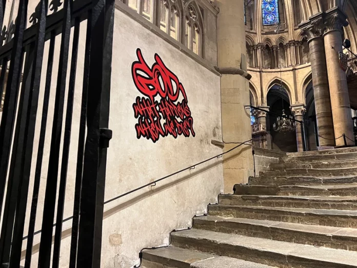 The exhibition began with a series of workshops involving members of such marginalised communities, specifically “Punjabi, black and brown diaspora, neurodivergent, and LGBTQIA+ groups”, asking participants to respond to the question “What would you ask God?” The result is a collection of questions, rendered in stock graffiti font and stickered to the walls of the Cathedral’s nave and crypt — questions like “Are you there?” and “Why are you indifferent to suffering?”