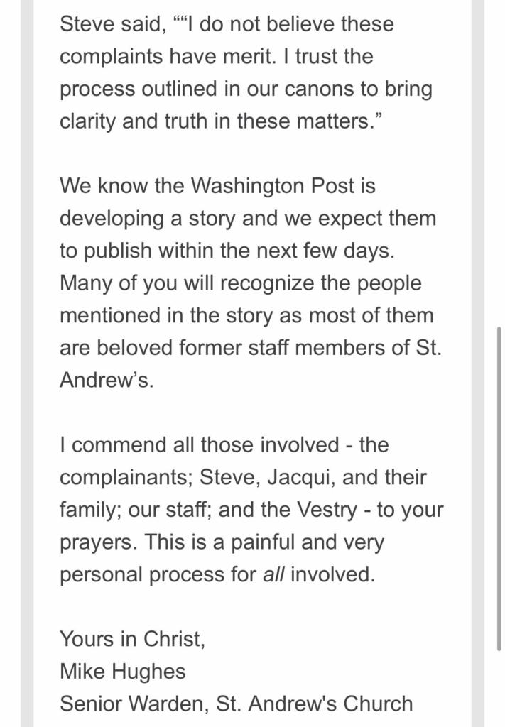 We know the Washington Post is developing a story and we expect them to publish within the next few days. Many of you will recognize the people mentioned in the story as most of them are beloved former staff members of St. Andrew’s.