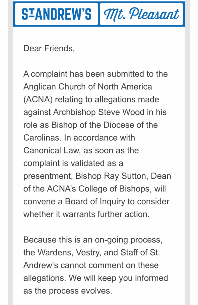 A complaint has been submitted to the Anglican Church of North America (ACNA) relating to allegations made against Archbishop Steve Wood in his role as Bishop of the Diocese of the Carolinas. In accordance with Canonical Law, as soon as the complaint is validated as a presentment, Bishop Ray Sutton, Dean of the ACNA’s College of Bishops, will convene a Board of Enquiry to consider whether it warrants further action.