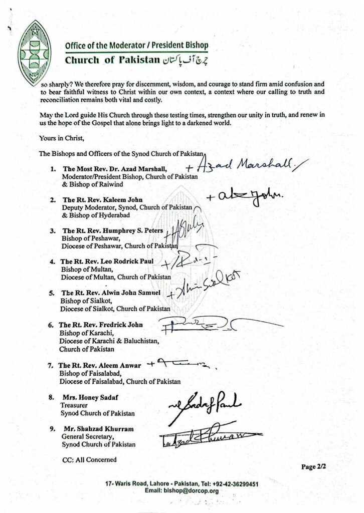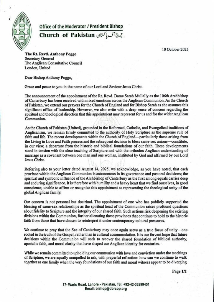 HomeMessagesChurch of Pakistan concerned over Mullally appointment Church of Pakistan concerned over Mullally appointment Messages Published on October 27, 2025 By Azad Marshall FacebookTwitterPinterestWhatsApp Bishops of the Church of Pakistan Please Help Anglican.Ink with a donation. TagsChurch of Pakistan SourceChurch of Pakistan Latest articles Messages SC Standing Committee calls for Inhibition of ++Wood To: The Anglican Diocese of South Carolina Grace, mercy, and peace from God the Father... November 15, 2025 News USPG conference on Anti-Human Trafficking and Modern Slavery held in India United Society Partners in the Gospel (USPG) successfully organised a Global Conference on Anti-Human... November 14, 2025 Messages First letter to the Faithful of the Diocese of the Highveld from the Intervention Task Team First-Communication-by-ITTDownload November 14, 2025 Op-Ed What is the future for complementarians in the CofE? The Bishop of Ebbsfleet, the Right Revd Dr Rob Munro, has written to the... November 14, 2025 Press Releases Archbishops’ Council response to Charity Commission case review Following the publication of the Charity Commission case review on safeguarding improvements, a spokesperson... November 14, 2025 More like this Messages SC Standing Committee calls for Inhibition of ++Wood To: The Anglican Diocese of South Carolina Grace, mercy, and peace from God the Father... November 15, 2025 News USPG conference on Anti-Human Trafficking and Modern Slavery held in India United Society Partners in the Gospel (USPG) successfully organised a Global Conference on Anti-Human... November 14, 2025 Messages First letter to the Faithful of the Diocese of the Highveld from the Intervention Task Team First-Communication-by-ITTDownload November 14, 2025